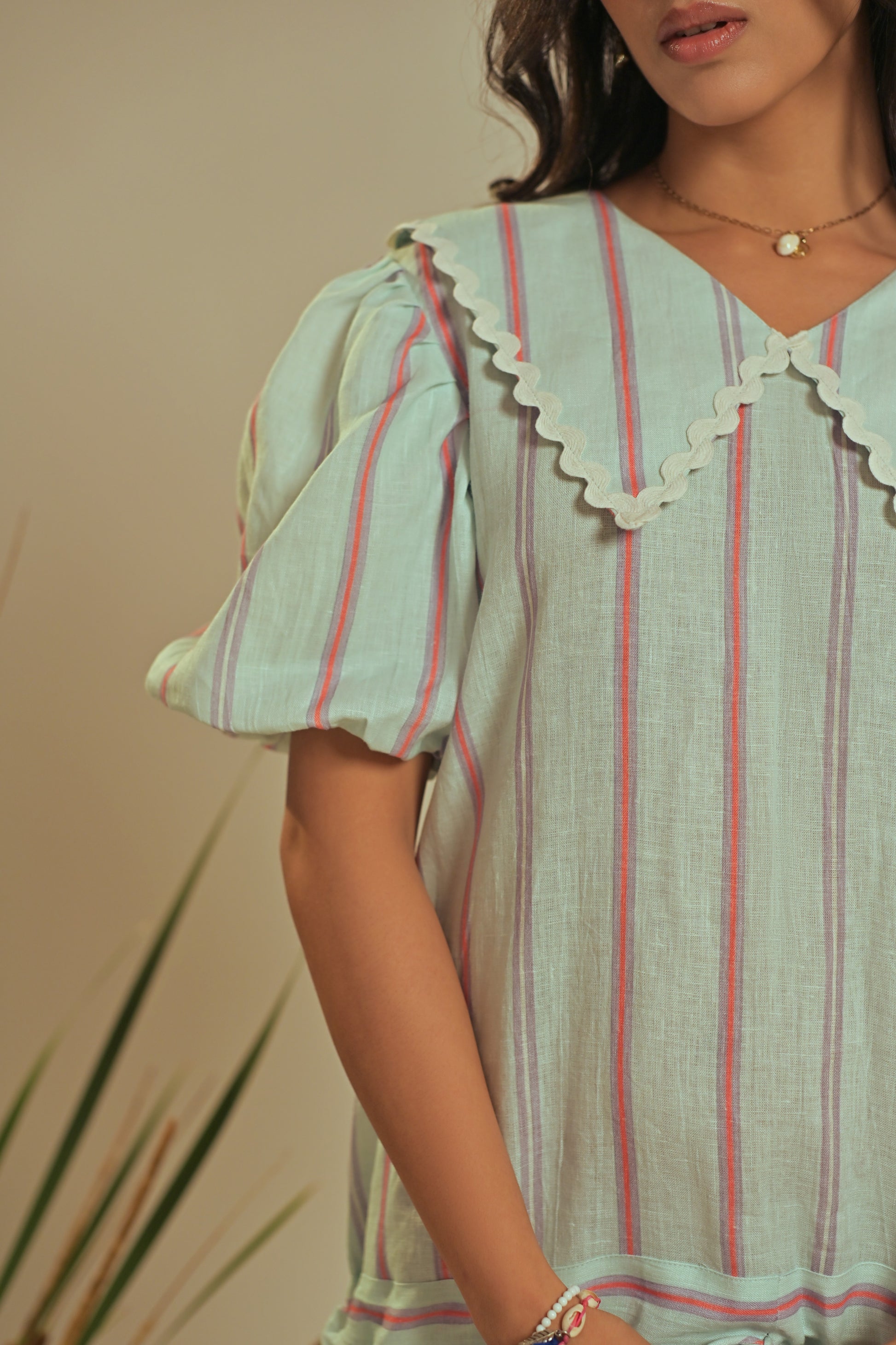 Featuring a broad collar and dramatic puff sleeves, this dress exudes charm and personality. The knot detail at the front adds a contemporary twist, making it a standout piece for brunches, casual outings, or garden parties. Its relaxed silhouette ensures ease of movement while keeping the look polished and chic.