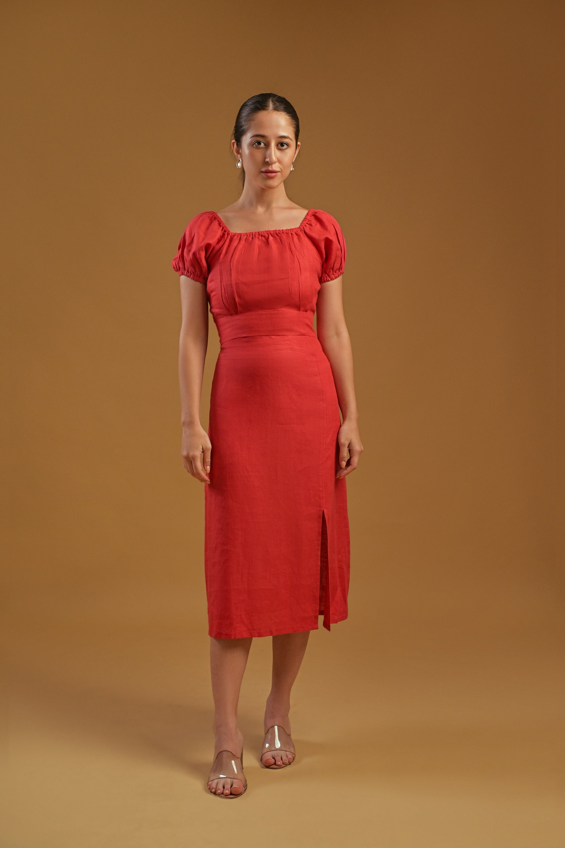 The to-the-fit silhouette highlights your shape while ensuring ease of movement, complemented by dramatic balloon sleeves that bring a touch of romance and style. A side slit adds both comfort and allure, making this dress perfect for evenings out, celebrations, or any occasion where you want to stand out with timeless grace.